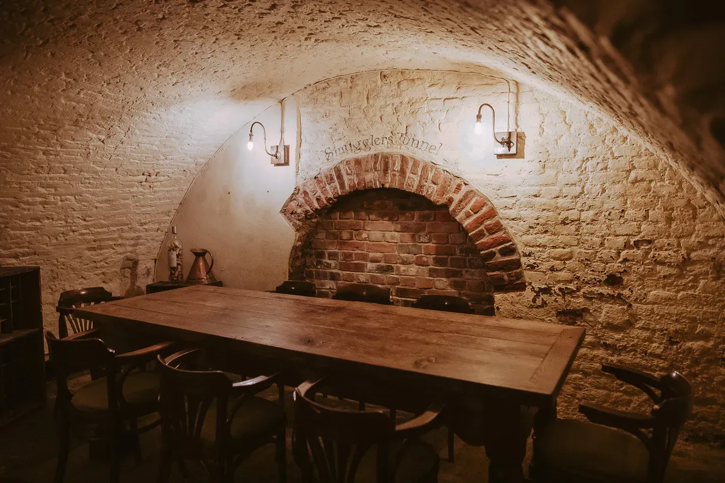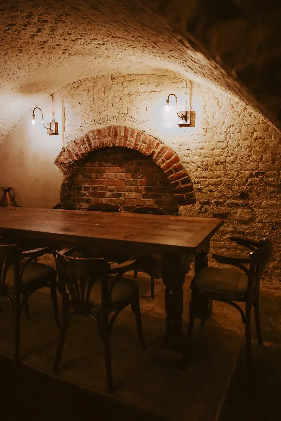 Wine, tobacco, textiles, whatever needed moving - when this place was a merchant's house in 1663, goods came straight off the Thames through a private tunnel and into the cellar. No paperwork, no taxman, no questions asked. The passage collapsed under Blitz bombs in 1940, but the bricked-up mouth of it is still down there in the Olde Wine Shades cellar.